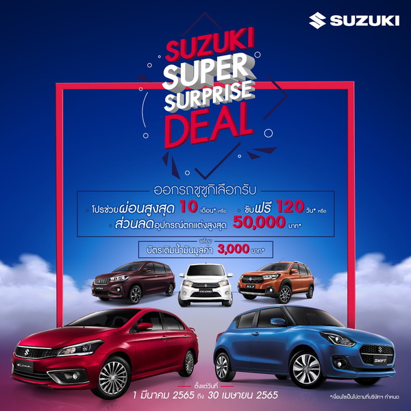 สำหรับการจัดแคมเปญพิเศษ “SUZUKI SUPER SURPRISE DEAL” เพื่อผลักดันยอดขาย รวมเพื่อเป็นการขอบคุณและตอบแทนความไว้วางใจของผู้บริโภคที่มอบให้แก่ซูซูกิ และมีความต้องการอยากเป็นเจ้าของรถยนต์สักหนึ่งคันที่มีความคุ้มค่าทั้งในเรื่องของราคาและการใช้งาน เป็นรถที่สามารถเข้าถึงและตัดสินใจได้ง่ายมากยิ่งขึ้นอีกด้วย ซึ่งเราเชื่อว่ารถยนต์จะเป็นปัจจัยหนึ่งที่มีความสำคัญในการดำรงชีวิตในปัจจุบัน