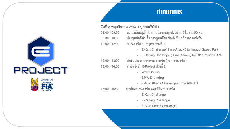 รายการ Thailand E-Project 2020 หรือการแข่งขัน Motor Sports สายพลังงานสะอาด ประกอบไปด้วย การแข่งขัน 1.E-Kart (รถคาร์ทไฟฟ้า) 2. E-Racing (เกม Simulator) และ 3. E-Auto Khana (รถยนต์ไฟฟ้า) โดยมุ่งเน้นให้เกิดการลดการใช้พลังงานน้ำมัน แล้วหันมาใช้พลังงานไฟฟ้าซึ่งเป็นพลังงานสะอาดทดแทนโดยในปีนี้เป็นการแข่งขันต่อเนื่องปีที่ 2 แล้ว โดยได้จัดพิธีแถลงข่าวการจัดการแข่งขันอย่างเป็นทางการไปแล้ว ณ ราชยานยนต์สมาคมแห่งประเทศไทย (ร.ย.ส.ท.) เมื่อ วันที่ 26 ตุลาคม ที่ผ่านมา
