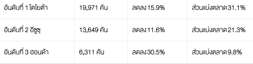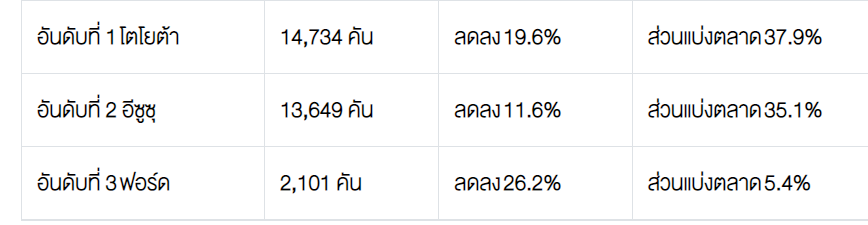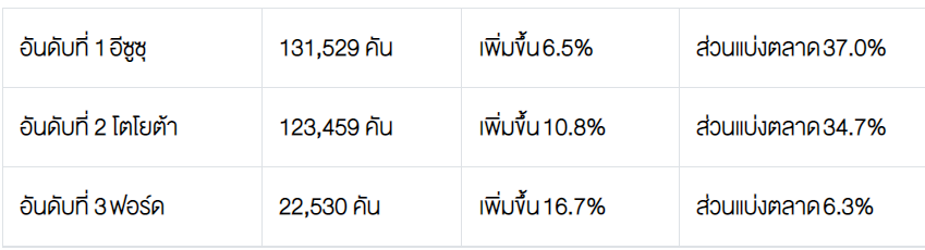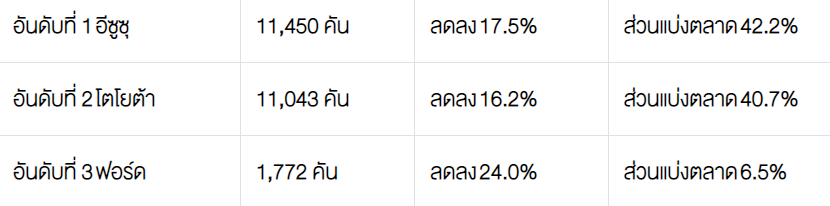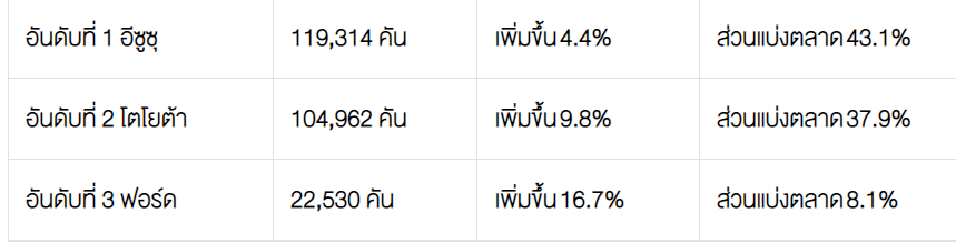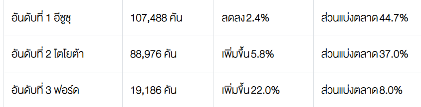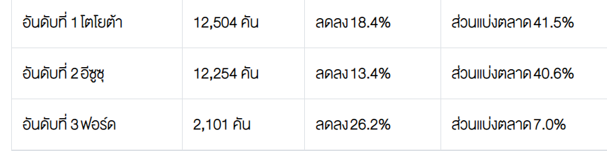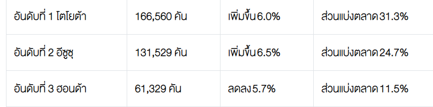 โตโยต้า 15,986 คัน – อีซูซุ 11,826 คัน – มิตซูบิชิ 4,532 คัน – ฟอร์ด 3,344 คัน – นิสสัน 472 คัน