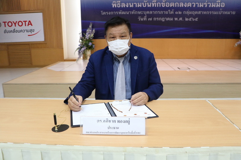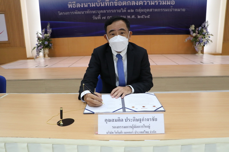 นายสมคิด ประดิษฐ์กำจรชัย รองกรรมการผู้จัดการใหญ่ บริษัท โตโยต้า มอเตอร์ ประเทศไทย จำกัด พร้อมด้วย นายสมชาย จักร์กรีนทร์ ผู้อำนวยการสถาบันไทย – เยอรมัน (Thai-German Institute) และ ดร.อภิชาติ ทองอยู่ ประธานคณะทำงานประสานงานด้านการพัฒนาบุคลากรในเขตพัฒนาพิเศษภาคตะวันออก (Eastern Economic Corridor Human Development Center) ร่วมลงนามบันทึกความร่วมมือระหว่าง บริษัท โตโยต้า มอเตอร์ ประเทศไทย จำกัด สถาบันไทย – เยอรมัน มหาวิทยาลัย และวิทยาลัยเทคนิคชั้นนำ 10 แห่ง ในเขตพัฒนาพิเศษภาคตะวันออก ในการดำเนินโครงการ “การพัฒนาทักษะบุคลากรภายใต้ 12 กลุ่มอุตสาหกรรมเป้าหมาย” เพื่อถ่ายทอดองค์ความรู้ในด้านเทคโนโลยี ยานยนต์ การผลิต และการบริหารจัดการเพื่อเพิ่มประสิทธิภาพการผลิตของโตโยต้า ตลอดจนร่วมศึกษาความเป็นไปได้ในการพัฒนาหลักสูตรองค์ความรู้และทักษะที่จำเป็นอื่นๆ แก่บุคลากรเพื่อเตรียมความพร้อมให้ตรงกับความต้องการของ 12 กลุ่มอุตสาหกรรมเป้าหมาย เมื่อวันพฤหัสบดีที่ 7 กรกฏาคม ที่ผ่านมา ณ ห้องประชุมออดิทอเรียม อาคารพนาเวศ โรงงานโตโยต้าบ้านโพธิ์ จังหวัดฉะเชิงเทรา