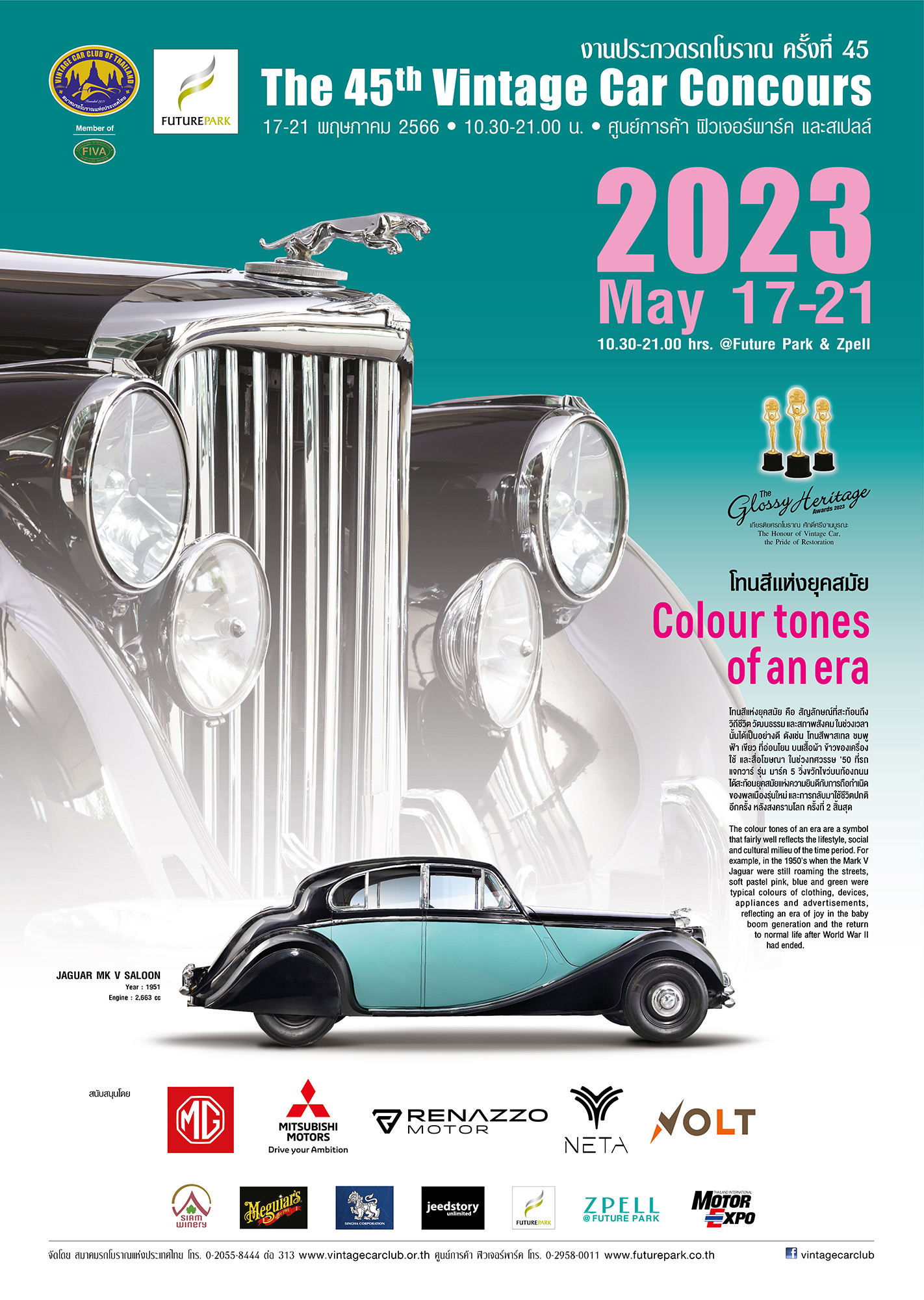 สมาคมรถโบราณแห่งประเทศไทย ร่วมกับ ศูนย์การค้าฟิวเจอร์พาร์ค และสเปลล์ จัด “งานประกวดรถโบราณ ครั้งที่ 45” ภายใต้แนวคิด “โทนสีแห่งยุคสมัย–Colour tones of an era”รวมรถหายากกว่า 100 คัน มาประชันคุณค่า ณ ชั้น G และ ZPELL ศูนย์การค้าฟิวเจอร์พาร์คระหว่างวันที่ 17-21 พฤษภาคม 2566